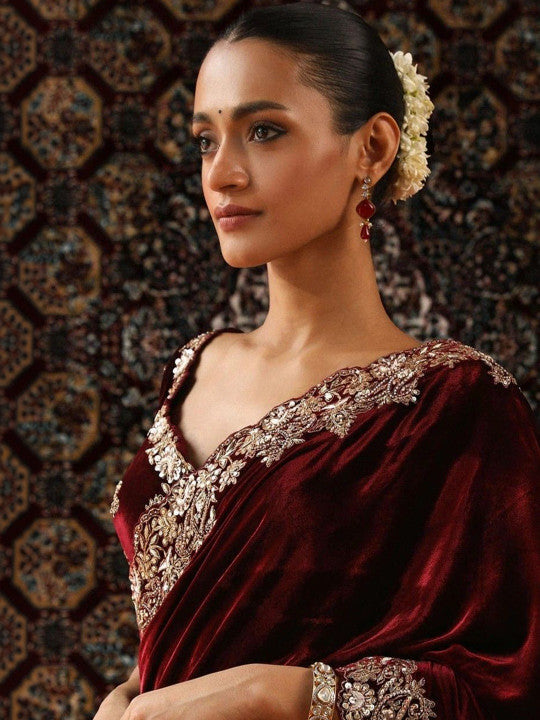 Fabric: VelvetColour: MaroonWork Type: Zari Work BLOUSE SPECIFICATION:Fabric: VelvetColour: MaroonWork Type: Zari Work Stitching Type: Unstitched SET CONTAIN:Saree With Blouse Piece In...